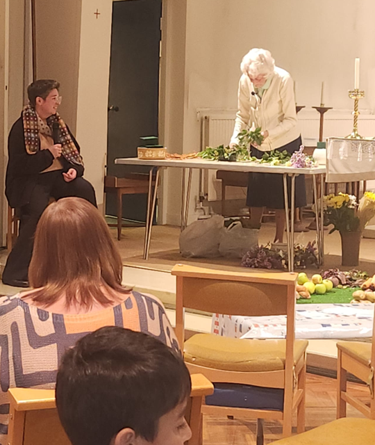 The weekend began with Messy Church on Thursday afternoon, when families were invited to make bread and smoothies; they decorated their globe for a display with the donated fruits and vegetables, shared a meal and made a joyful noise to the glory of God. Friday evening saw Mary Powell —our beloved flower arranger—demonstrating her skills and expertise in ‘Demo Time’ and revealing stories of love and faith, and daring adventure, complete with wine and cheese. Her creativity, warmth and clearly explained tips helped many overcome their nerves and inspired them to give flower arranging a go during Saturday morning’s free Community Café!